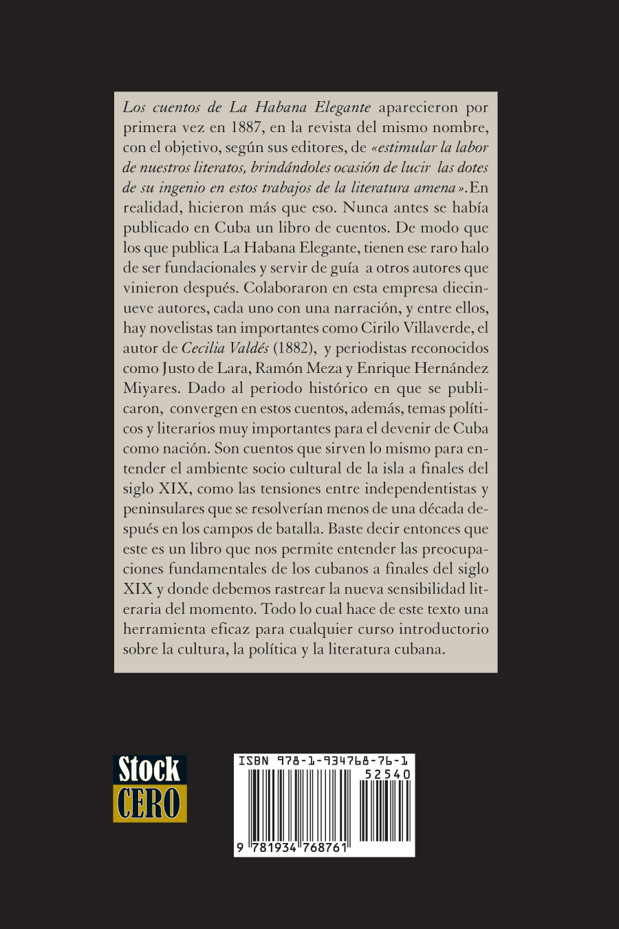 Cuentos de La Habana Elegante rescues the first shortâstory collection ever published in Cuba (1887), originally issued by the literary magazine La Habana Elegante. Nineteen authors contribute one narrative each, including major figures such as Cirilo Villaverde (author of Cecilia ValdĂ©s), Justo de Lara, RamĂłn Meza, and Enrique HernĂĄndez Miyares.