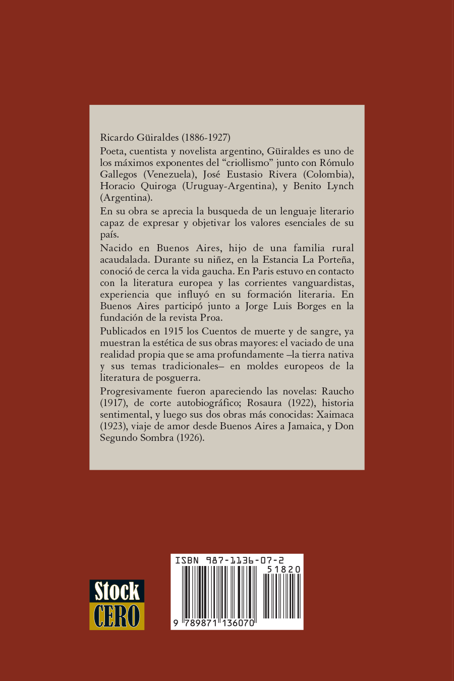 Ricardo Güiraldes (1886–1927)—poet, short‑story writer, and novelist—is one of the key figures of Argentine criollismo, alongside Rómulo Gallegos, José Eustasio Rivera, Horacio Quiroga, and Benito Lynch. In Cuentos de muerte y de sangre (1915), his first book of short stories, we already see the aesthetics that will culminate in Don Segundo Sombra.