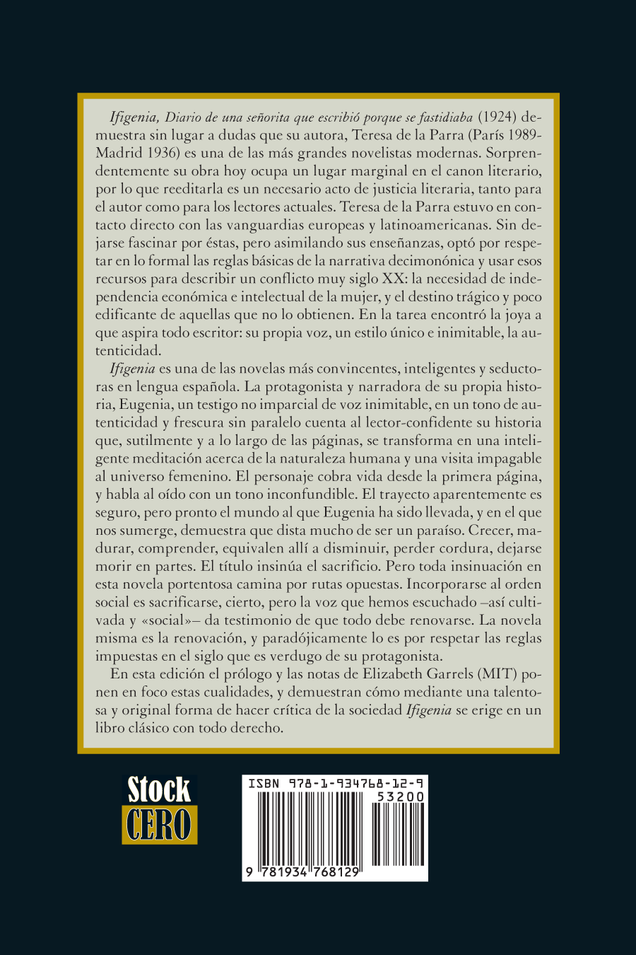 Ifigenia: Diario de una señorita que escribió porque se fastidiaba (1924) by Teresa de la Parra (1889-1936) is a masterpiece of modern Latin American literature. The novel, structured as a long letter and a diary, recounts the story of **María Eugenia Alonso**, a young Venezuelan woman who returns to Caracas after being educated in Paris. Hoping for independence, she finds herself trapped in a conservative, patriarchal society governed by strict codes for women.