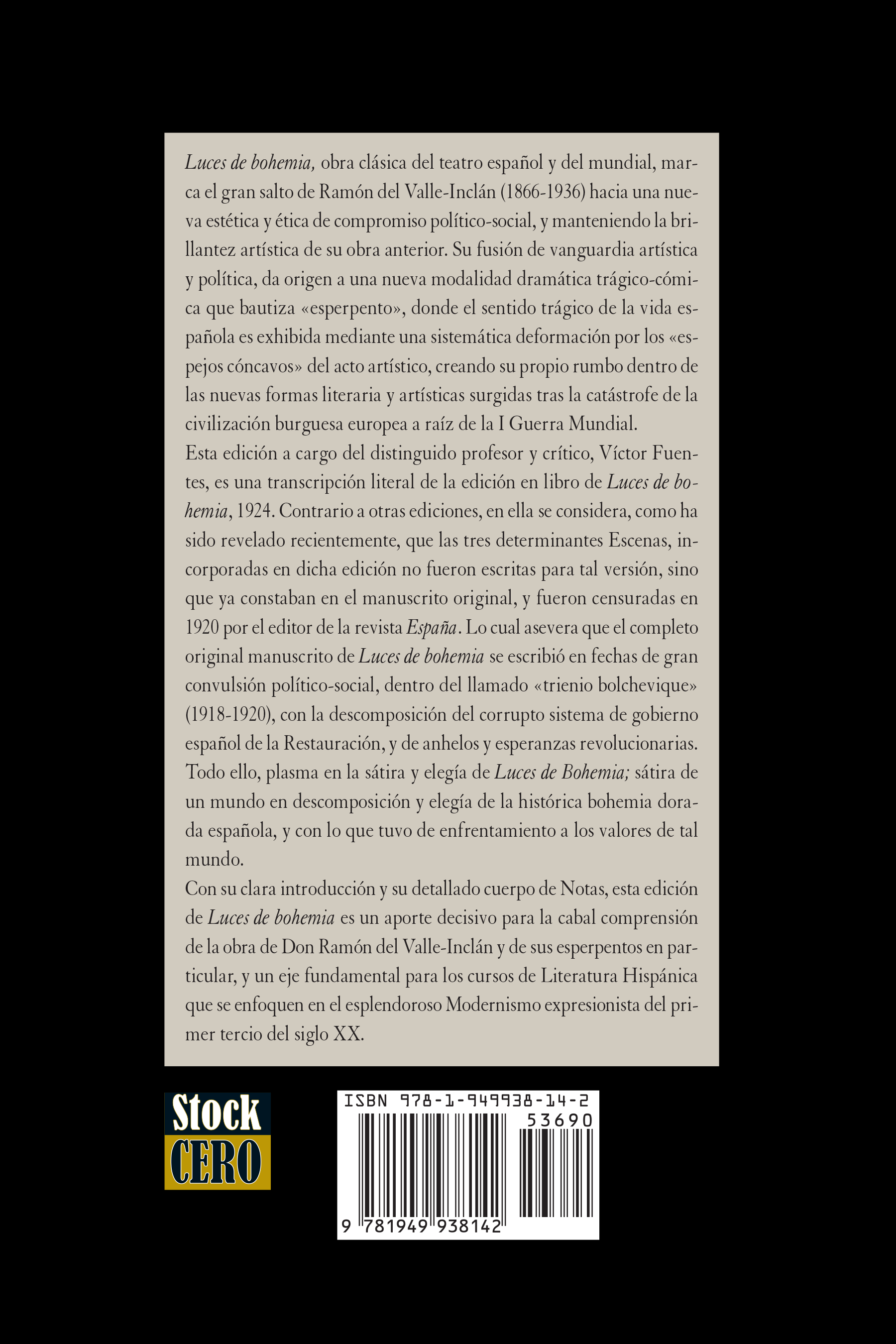 Ramón del Valle-Inclán's Luces de Bohemia (Lights of Bohemia), first serialized in 1920 and published in book form in 1924, is a canonical work of Spanish and global theater. It is the seminal text that introduces the concept of “esperpento”, a literary genre defined by the systematic deformation of reality to reveal the grotesque and tragic absurdity of life. This edition benefits from recent archival discoveries, confirming that previously expurgated scenes (critical for understanding the socio-political context) were part of Valle-Inclán's original manuscript.
