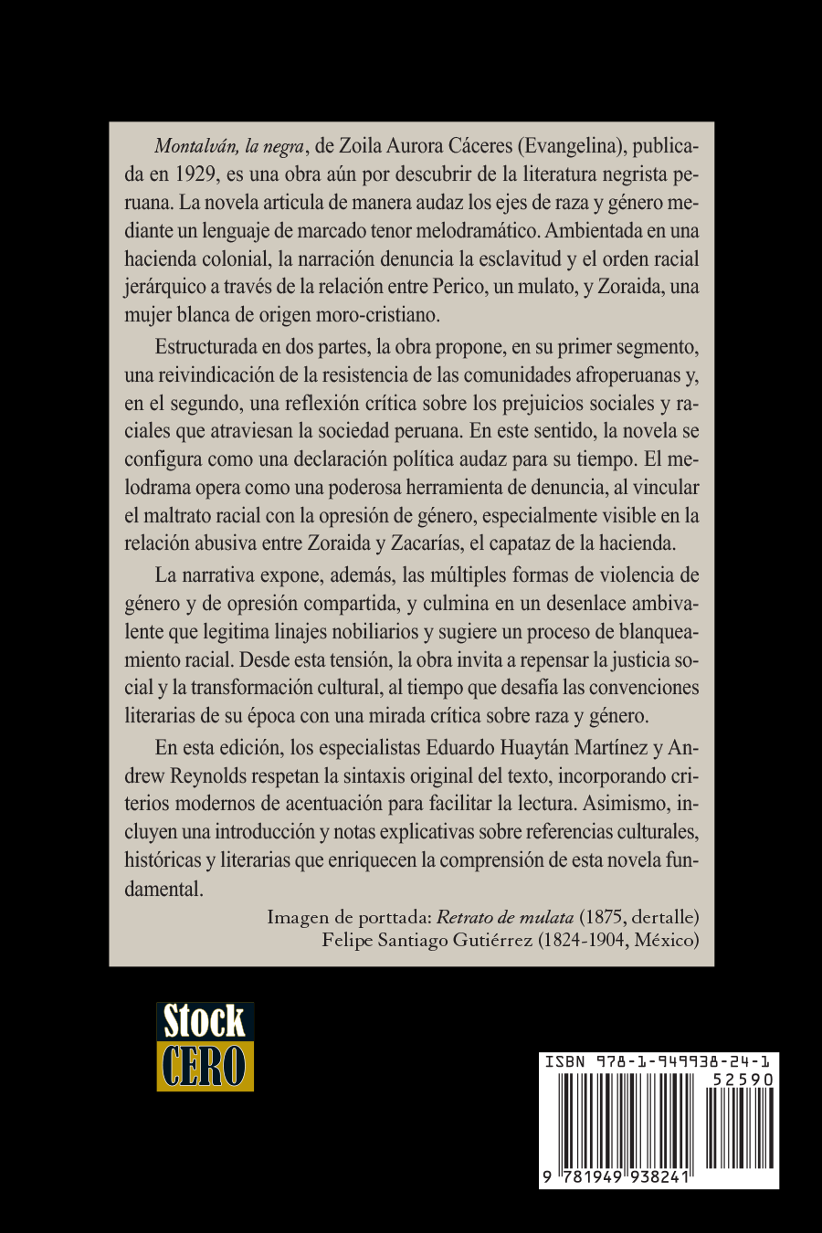 Zoila Aurora Cáceres Moreno (1872-1958) was a pivotal figure in Peruvian and Hispano-American Modernism, a feminist pioneer, and a transdisciplinary intellectual. Her nouvelle, Montalván, la negra, originally published in her 1929 collection La princesa Suma Tica, reveals a lesser-known facet of her work: a keen interest in Afro-descendant racial politics. It is a powerful reinterpretation of Peruvian slavery through the lens of a fictional insurgency, blending modernist, realist, and even naturalist tones.